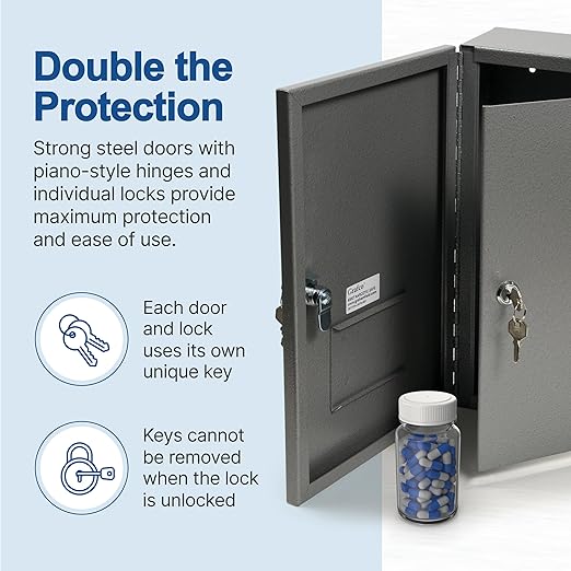 - Double-Door Protection – Reinforced steel double doors with full-length piano hinges offer added security and peace of mind for storing sensitive medications.