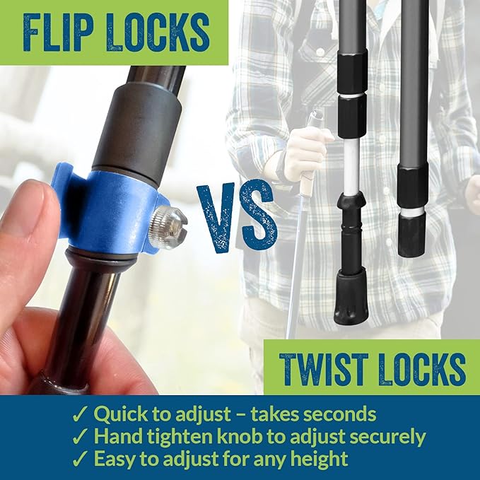 - ADJUSTABLE & COLLAPSIBLE: Telescoping poles adjust from 32" to 54" using new exclusive flip lock - better than twist locks. Perfect for walkers and hikers since it adjusts to any height from children and adults up to 6'2". Designed for walking and hiking, these are better than ski poles for walking