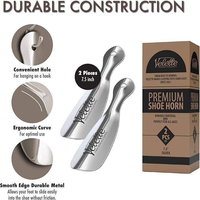 Velette Metal Shoehorn - 2 Pack 7.5" Long Shoe Horn, Travel Shoe Horn for Kids, Men & Women - Shoes Helper, Spoon, Travel Size Shoehorn for Boots, Shoes, Sneakers, Heels and More