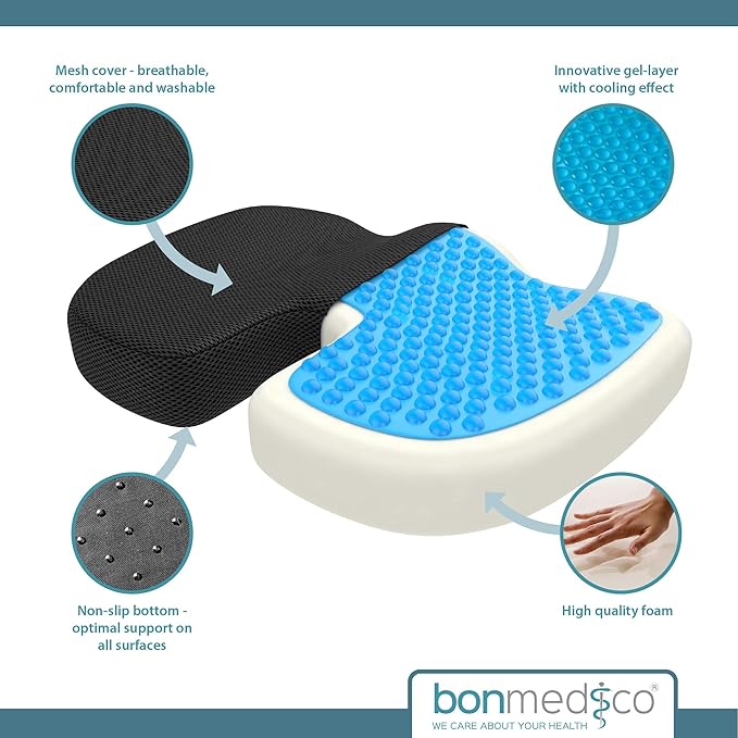 bonmedico Orthopedic Seat Cushion X-Large – Gel Memory Foam Chair Cushion for Tailbone, Sciatica & Lower Back Relief – Ergonomic Office Chair Cushion & Car Seat Cushion, Washable Cover, Non-Slip Base