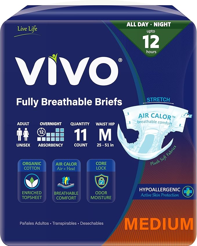 VIVO Organic Cotton Overnight Sensitive Skin Adult Incontinence Diaper Briefs with Tabs, Medium 11 Count