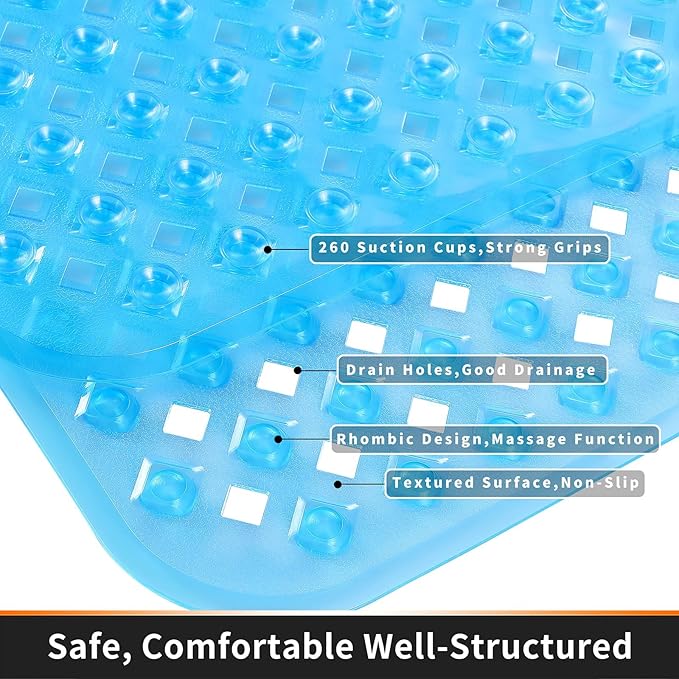 Yimobra Non Slip Bath Mat, Super Strong Suction Cups,34.5"x15.5"Long Tub Mat with Drain Holes, Machine Washable Fast Draining Shower Mats, Bathroom Essentials,Clear Blue