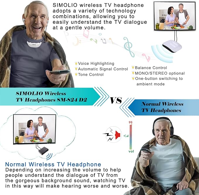 - SINGLE DIGITAL WIRELESS TV HEADPHONES - Voice highlighting & noise reduction reduce TV background sounds and make dialogues stand out. Auto signal control makes the output stable, which avoids the hurt caused by a sudden increase in TV volume.