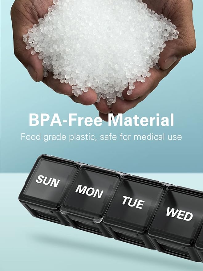 - Long-Lasting Printing: This 7-day pill box features bold marks for the week, making it simple to track your pills without needing to remember. The upgraded printing ensures that these marks remain durable, lasting up to 10,000 uses without showing any wear and tear.