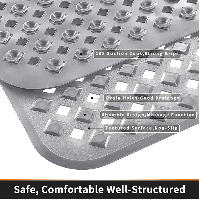 Yimobra Non Slip Bath Mat, Super Strong Suction Cups,34.5"x15.5"Long Tub Mat with Drain Holes, Machine Washable Fast Draining Shower Mats, Bathroom Essentials,Clear Gray