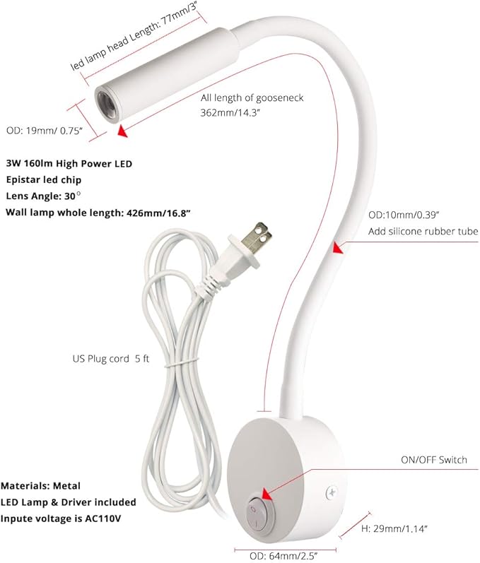 - FLEXIBLE GOOSENECK: Adjusatble reading lights with 285mm/11.2" long neck which easy to adjust to the desired lighting area. Perfect suit different sitting positions or lie posture on the bed.