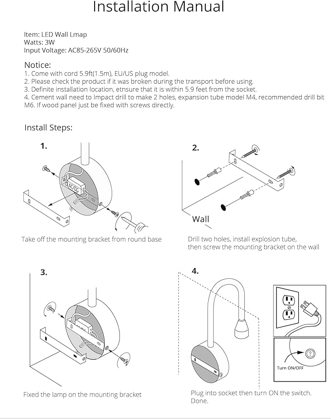 - Connection Method: US plug in wall sconce. Cord Length: 5.9ft. Surface mounted on wall, headboard, book shelf, worktop ect. Please budget the distance to the socket in advance according to the wire length before installation. ON/OFF switch built on the base. With long strong adjustable neck