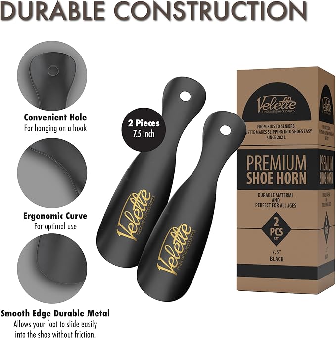 Velette Metal Shoehorn - 2 Pack 7.5" Long Shoe Horn, Travel Shoe Horn for Kids, Men & Women - Stainless Steel Shoes Helper, Spoon, Travel Size Shoehorn for Boots, Shoes, Sneakers & Heels - Black