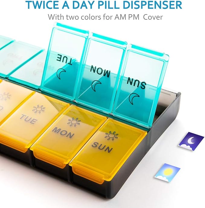 - 【TWICE A DAY REMINDER】7 day oversized pill organizer, 1-week medicine organizer, day and night compartments help you to plan and remind of your daily doses.