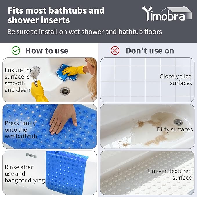 - Hundreds of Suction Cups: Yimobra's premium bath and shower mats boast 200 special large suction cups, offering superior adhesion compared to smaller ones. We recommend giving the mat a few firm presses with your feet before use to enhance its grip, ensuring it securely attaches to smooth, clean, and dry surfaces for a safer bathing experience. Whether for home use, the gym, or shower rooms, this mat comes in a variety of colors and sizes, making it the optimal choice for American households!Please note that it is not suitable for use on textured, tiled, or non-smooth surfaces