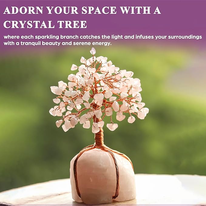 - Elegant Rose Quartz Crystal Tree on a Rose Quartz Stone Base : This stunning crystal tree features natural rose quartz crystal meticulously hand-wrapped into the shape of a vibrant tree of life. Standing approximately 5"-6" tall with a base size of 2"-3", this piece blends artistry with the spiritual charm of crystals and healing stones. This gemstone tree brings balance, clarity, aligning beautifully with crystals and healing stones.
