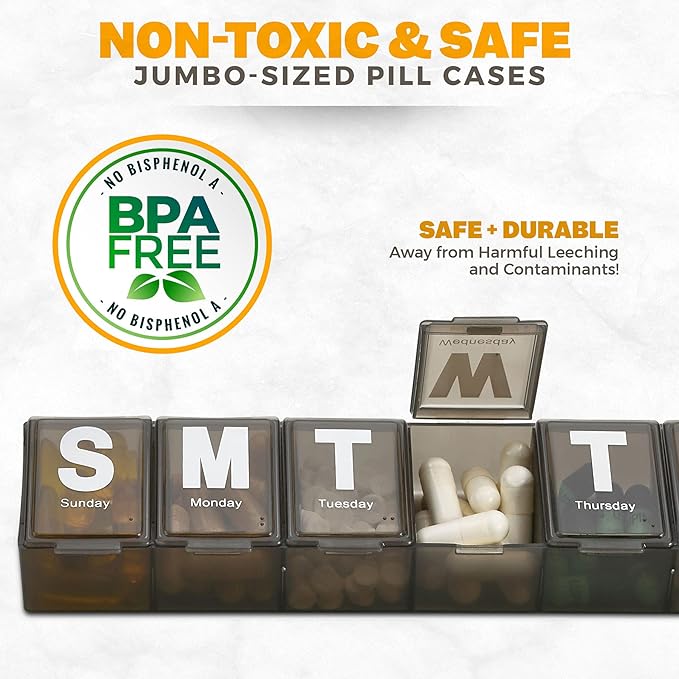 - BPA FREE! SAFE + DURABLE: Unlike other pill cases which break or crack during shipping, our product is made from an extra durable plastic which means that your medication is kept safe and secure. Our product is BPA FREE and NON-TOXIC. That means your medications is safe in our weekly pill organizer and away from harmful leeching and contaminants!