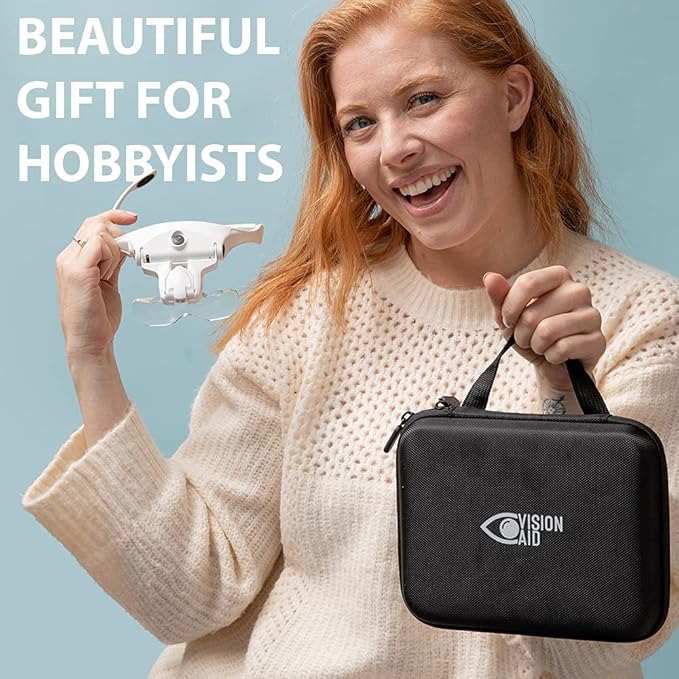 - HANDS FREE LIGHTED MAGNIFIER WITH A STORAGE CASE - VisionAid headset comes with 5 magnification lenses 1x, 1.5x, 2x, 2.5x, 3.5x, rechargeable LED Light, regular temples and an interchangeable elastic head strap. ✔️The Protective Storage Case keeps your VisionAid Safe and Clean so you can enjoy its benefits longer, is great for travelling and makes a beautiful gift!