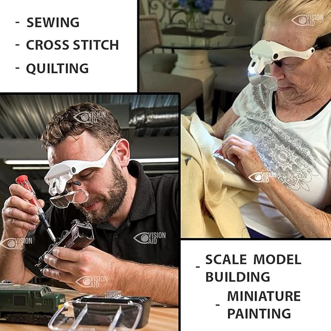 - MAKES DETAIL WORK & FIDDLY TASKS EASY - Vision Aid head magnifier provides ideal magnification for close work : Hand Embroidery, Jewelry making, Miniature painting, Scale model, Eyelash extensions, Nail painting, Fly tying, Electronic repair, Sewing, Cross stitch, Crochet, Painting by Numbers, Diamond Painting, Reading. ✔️People with macular degeneration also find VisionAid useful for reading books and looking at small print on pill bottles.