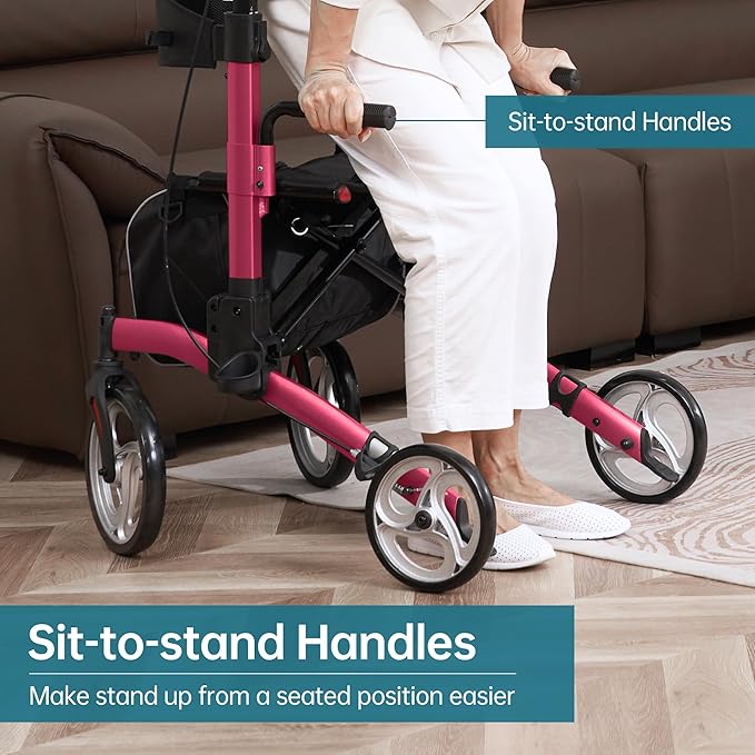 ELENKER Upright Rollator Walker, Stand Up Rolling Walker, Mobility Walking Aid with 10” Front Wheels, Seat and Armrest for Seniors and Adults, Red