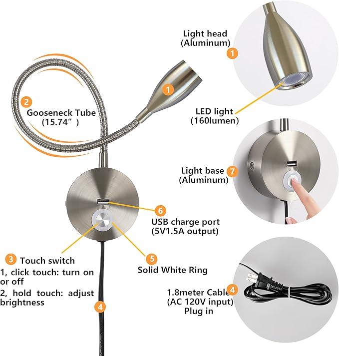 LED Wall Reading Light with USB Charging Port, Dimmable Gooseneck Bedside Lamp, Flexible Arm, 3W, (Nickel, 120V Plug in, Warm White)