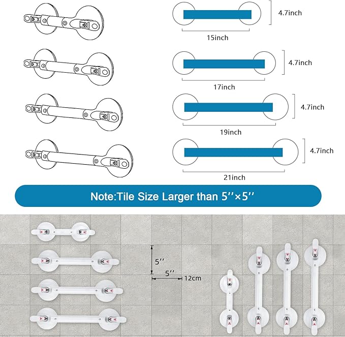- 【Buying Guide】Before purchasing, note that these suction bath & shower grab bars can only be attached to flat, non-porous, and rigid surfaces , Ideal for natural movement and standing up. For tile installations, ensure each tile is larger than 5"*5" and the suction cups avoid grout lines.