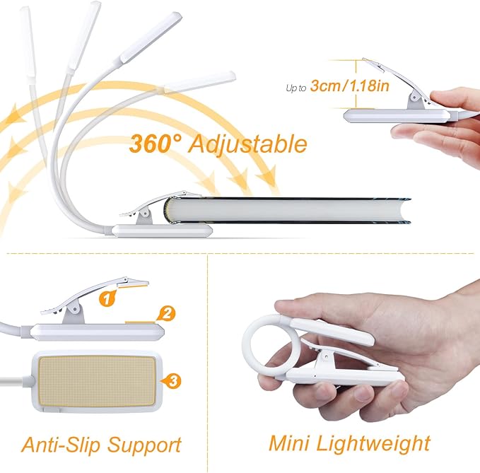 - 360° Flexible Neck & Sturdy Clip: 360° bendable goose neck can be rotated to any angle you want. Anti-skid clip design makes it firmly clamp on an e-reader, books, shelf, etc.