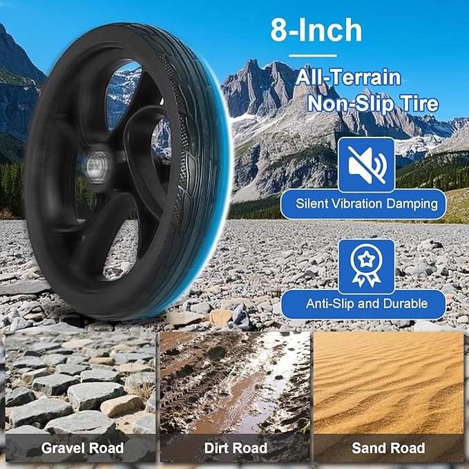 - Security & Stability:The scientific curved bottom frame can provide better support. The specially designed shock absorption function makes it more comfortable during use,8”front wheel and 8”rear wheel,easy maneuvering. Ergonomic adjustable locking handbrake provide better safety.