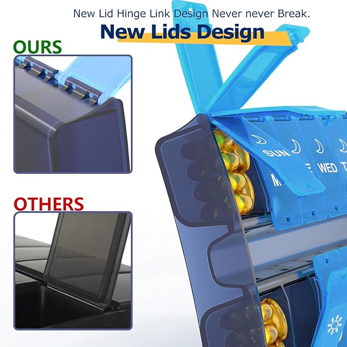 - 【 Hinged Lid Pill Sorter, Durable Weekly Pill Case Box】Unique hinged lids design pillbox, durable for daily use, support 10,000 times open without break.