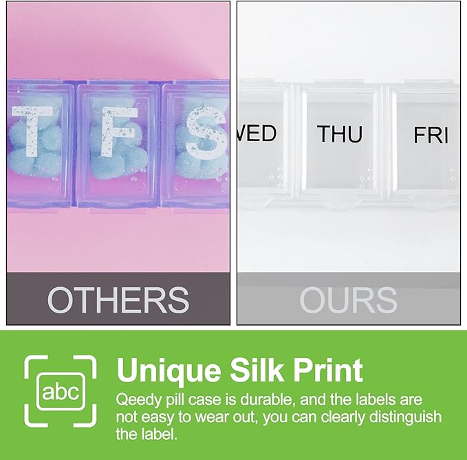 - 【 Not Easy To Fall Off Printing 】 To avoid screen-printing fonts and icons falling off from the surface of the pill box, we use high-end screen printing ink, you don't worry the "Printing word" will be missing and taking the wrong pill by mistake
