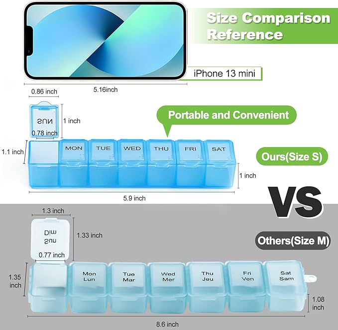 - 【 Small Size & High Capacity 】 7-day pill organizers are quite nice for easy daily dispensing and enough space for filling and sorting all your pills for the entire week. Small and portable size, perfect for your travel or on-the-go. (The size of each compartment measures approx. 1.1" x0.86" x1")