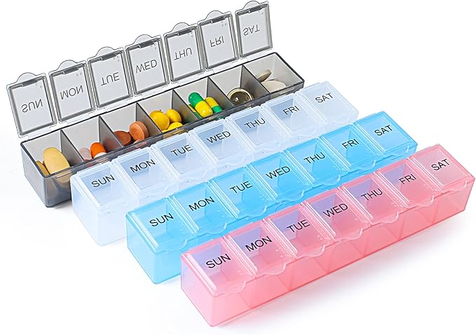 4 Pack Weekly Pill Organizer, 7 Days Pill Case Travel Daily Pill Box Portable Medicine Organizer and Planner with Compartment for Vitamins, Fish Oil, Supplements and Medication (4 Colors)