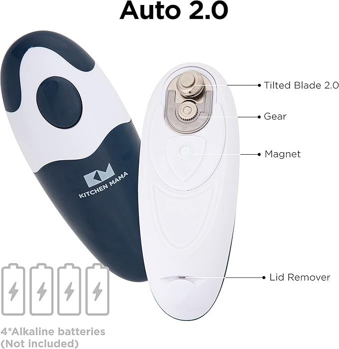 - User-Friendly One Button Operation: The Kitchen Mama Auto 2.0 is perfect for almost any can, indoors or outdoors; just press the easy-touch start/stop button for hands-free, painless use; requires 4 AA batteries (not included)