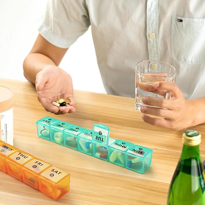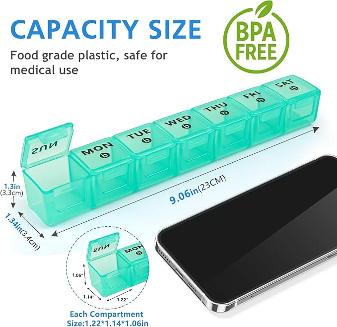 - EASY-TO-READ & DURABLE PRINTING: This 7 day pill organizer features bold, high-quality day markings that remain clear and legible even after long-term use. The upgraded printing resists fading and rubbing off, making it easy to track your pills every day without worrying about wear or peeling.