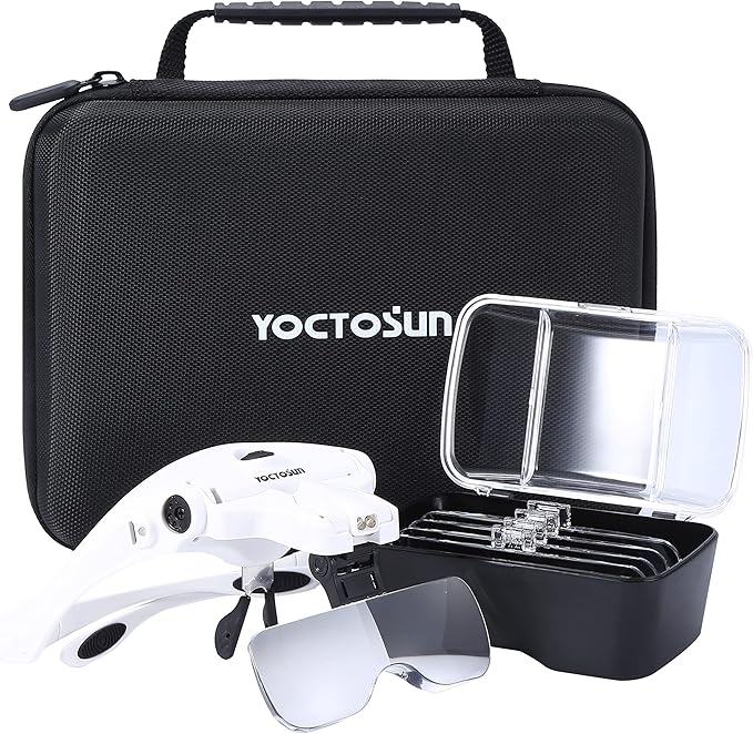 YOCTOSUN Magnifying Glasses with Light, Head Mount Magnifier with 5 Lenses, Headband, Storage Case, Hands Free LED Lighted Head Magnifying Visor for Close Work Hobby Crafts