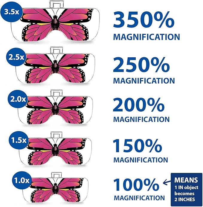 - Makes Close-up Work Easy - comes with 5 magnifying powers: 1x, 1.5x, 2x, 2.5x, 3.5x. A 1x magnification power is a 100 percent increase in the magnified object's size For example, a 1-inch object at 1x would appear to be 2 inches.