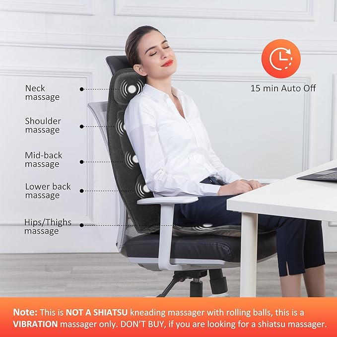- Vibration Massage -The back massager with 10 powerful vibrating motors (8 spot for back and 2 for thighs ) and heat function, provides soothing gentle massage for back,thighs to help relieve stress,tension.