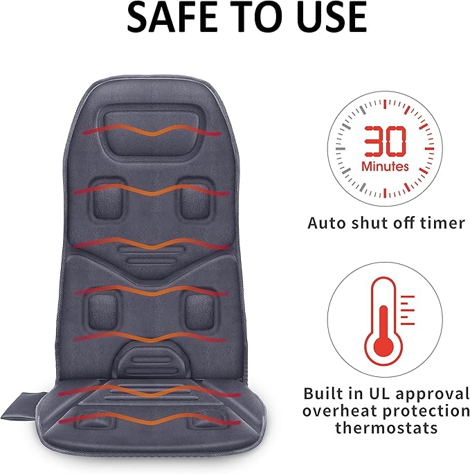 - Safe & Reliable, The back massager pad is equipped with overheat protection thermostat controller that is UL listed, rigorously tested for quality control and safety. Each heating pad with auto shut off feature ensures safe use. The timer is 30mins to automatically switch off. For any reason, if you are not 100% satisfied with this massage cushion, just return it within 30 days.