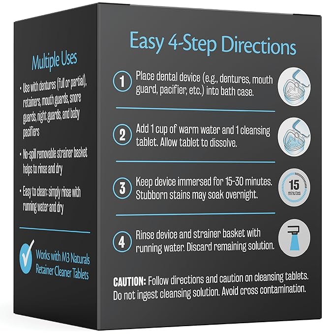 - Durable & Spill-Free. Our denture cups for soaking dentures will last. Thanks to the strong double hinge design, this retainer cleaning case is both functional and durable. The inner basket lifts out of the dental bath so that your dental appliance cleaning process is easy and hygienic. M3 Naturals is a brand that contains products that contain natural ingredients and other ingredients. However, all M3 items are quality tested in the USA with the highest standards.