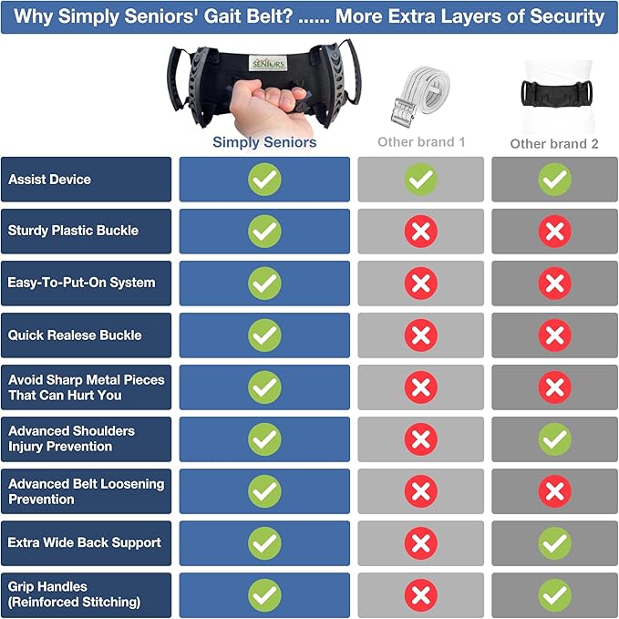 - 🆙 GET UP/DOWN EASILY AND IMPROVE YOUR BALANCE. If you have health problems, including balance and strength issues due to Parkinson's, dementia, a stroke, or after surgery, this gate belt is a must-have. Your caregiver or family member can easily lift you to a standing position using the sturdy handles without hurting you or helping you to feel secure when walking as he or she holds the loop on the back