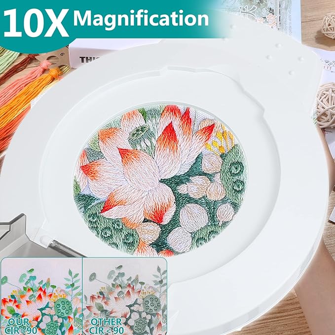 - 10X&4.2'' Large Glass Lens: Wider 4.2'' large lens LED magnifying lamp presents you with larger projection range and clear view, without optical distortion and doesn’t fog like cheap acrylic or plastic lens. The magnifying glass with light and stand can magnify tiny objects up to 10X without optical distortion, which is very suitable for jewelry making, sewing, painting, cross-stitch, soldering.