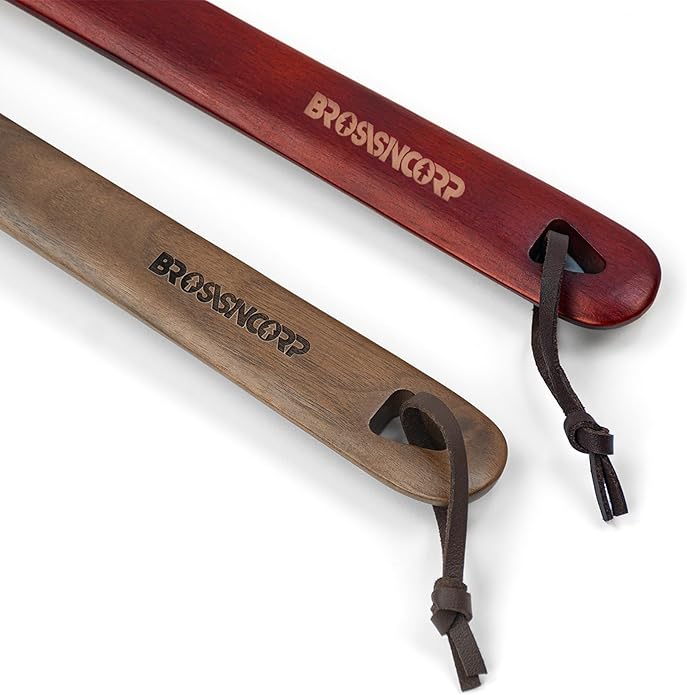 - COMFORTABLE DESIGN: Nicely shaped round thick long-handled topped with a hanging leather loop; The horn is designed to fit the curvature of the back of the foot, and the spoon thickness is perfectly moderate. Using our strong wood wide shoe horns long handled can fit your foot easily slide into the shoe