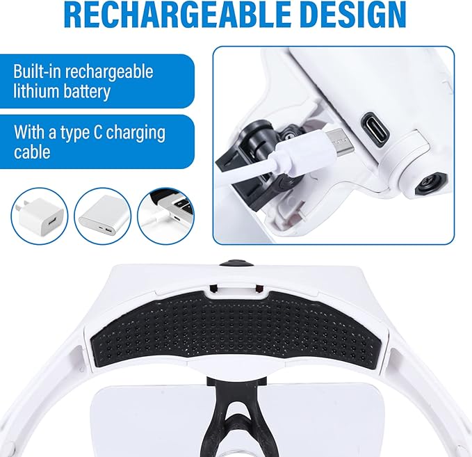 - USB Charging Design: This magnifying glasses with light is equipped with a rechargeable built-in lithium battery and comes with a USB Type-C cable, simply plug the cord into the magnifier and the other end into the slot of a USB power source(such as a USB wall charger, a cell phone charger or a power bank, not included) and it automatically charges. Save money and energy while enjoying long lasting bright light. You will never need to buy batteries again!