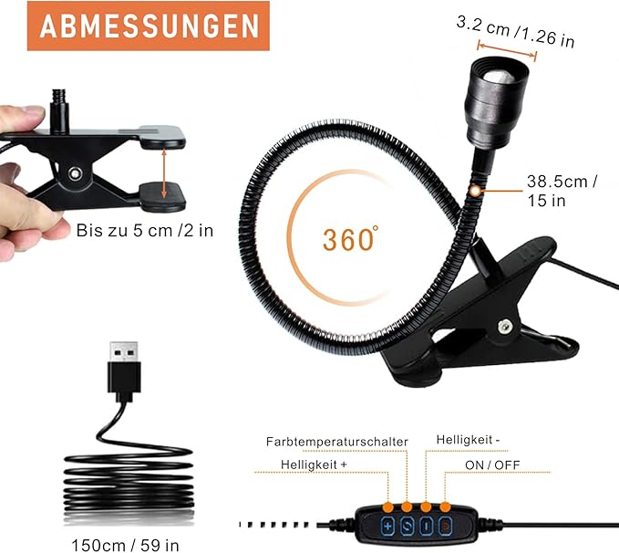 - 【Strong Clamp and Flexible Arm】The led reading light has a strong clip with a non-slip gasket and a 5cm opening, which can be easily fixed on desks, craft tables, work areas, bedside and bedroom bookshelves and more. Compared to other 8mm goosenecks, we use 9mm diameter gooseneck, which allows you to easily adjust 360 degrees, not easy to bounce, providing a stable and most comfortable angle for your reading.
