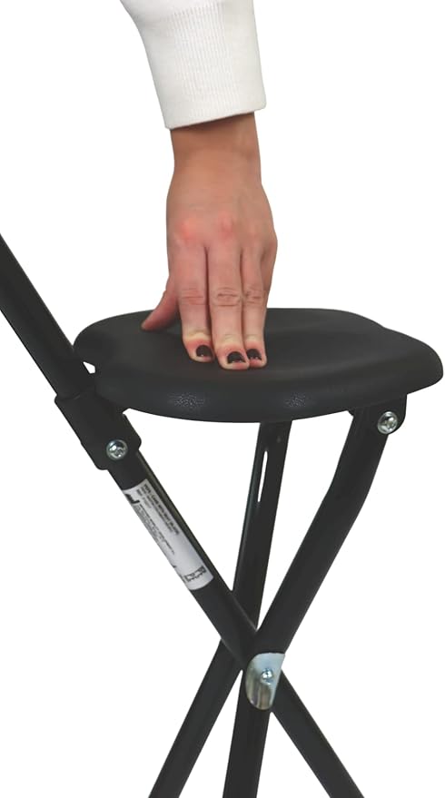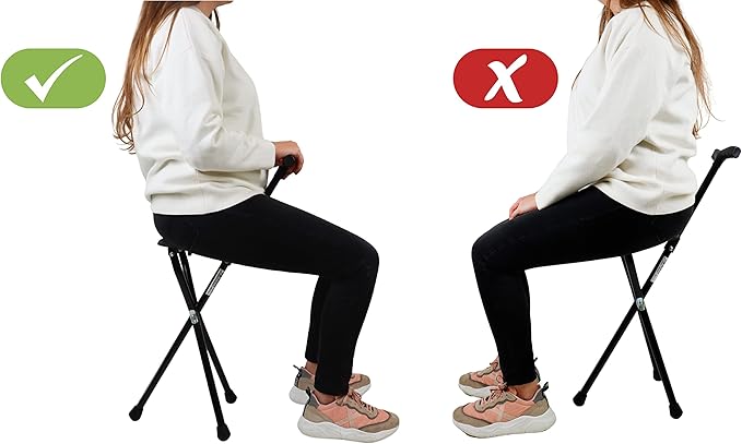 - ♥ FOLDING SEAT: The walking cane has a foldable seat (8.5 x 7.6 inches) which can be fold down easily to use it as a chair. Once unfolded, the walking stick handle must be placed at the front when sitting down. IMPORTANT: Do not use the handle as a backrest.