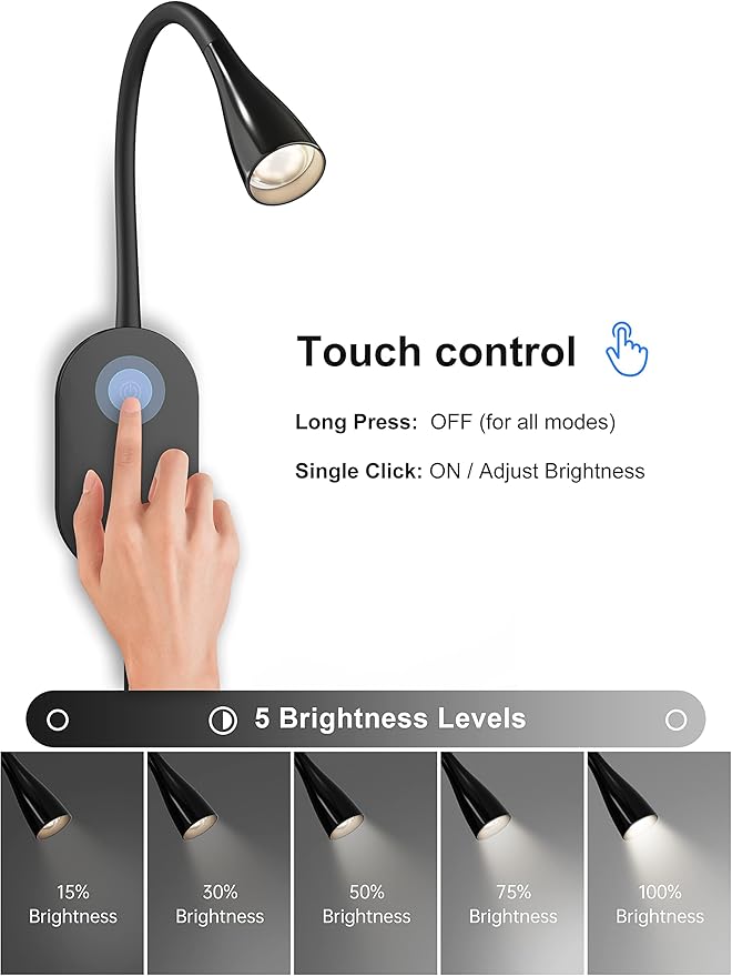 - 【 5 Brightness Touch Control 】The touch switches LED bed lamp with 5 levers dimming to meet your various environmental requirements. Single click dimmable and long press turn off.