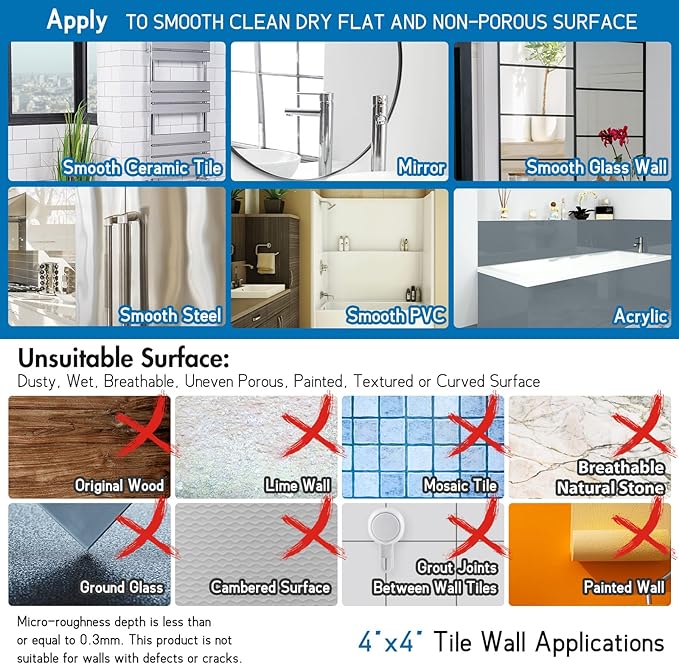 - Buying Guides: Please read this before you buy: (1) This shower Grab Bars is used to help support a person's body instead of stand full body weight. (2) Only works on tile size LARGER THAN 4x4". (3) CANNOT be applied over grout lines or textured surfaces. (4) Must be applied to smooth, flat, non-porous surfaces
