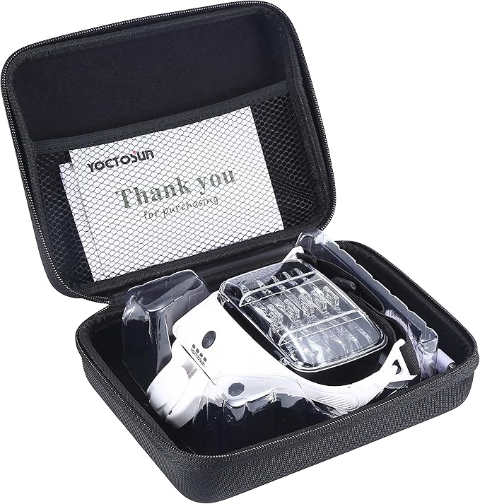 - LED HEAD MAGNIFIER WITH A STORAGE CASE:Headset Magnifier comes with 5 magnification lenses 1x, 1.5x, 2x, 2.5x, 3.5x, rechargeable LED Light and an interchangeable elastic head strap. Scratch-resistant acrylic lenses reduce weight. Protective Storage Case keeps your magnifying glasses Safe and Clean, great for travelling,perfect gift for families and friends.