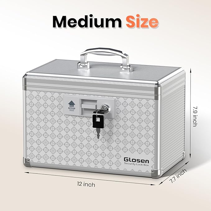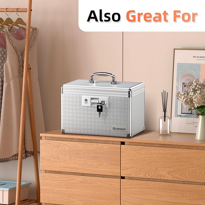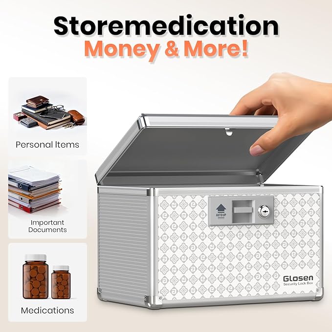 - LONG-LIFE LOCK BOX: Glosen box is made of aluminum alloy with high quality. Has a sturdy and durable body, corrosion resistance, waterproof, Anti-drop and impact resistance, giving you a safe space to store medicines and essentials. Polished surface gives you a better mental touch