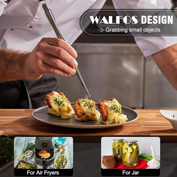 - 1. PREMIUM MATERIAL - Walfos kitchen cooking tweezers are made of high quality food grade stainless steel , have good rust and heat resistance. It is non-toxic and safe to use. The thickened kitchen tweezers are very sturdy, While keeping it light and easy to handle!