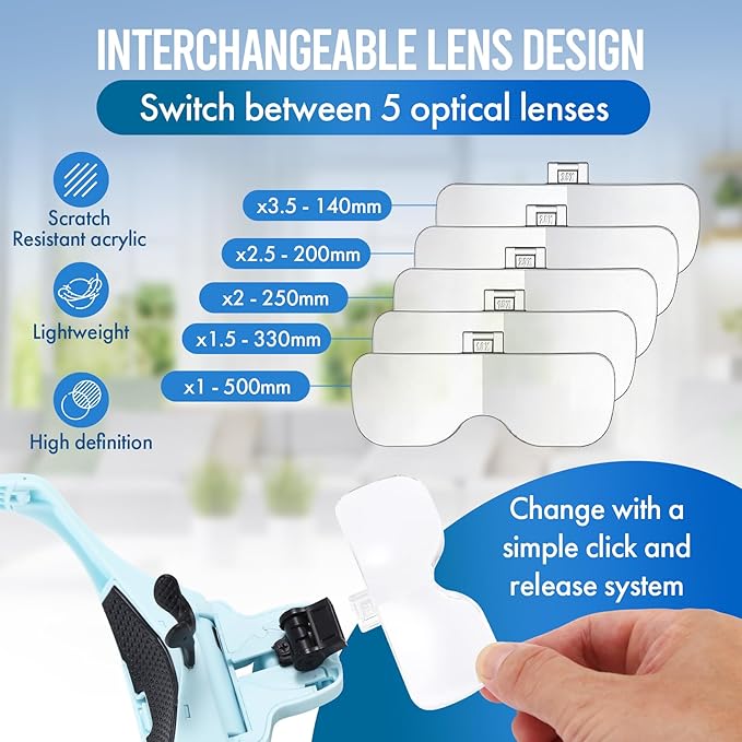 - Interchangeable Lens Design: Switch between 5 optical lenses using a simple click and release system. Magnification power of the head magnifier: 1.0X, 1.5X, 2.0X, 2.5X, 3.5X. Scratch-resistant acrylic reduces weight. All lens come in a sturdy storage box to keep them organized and protected.