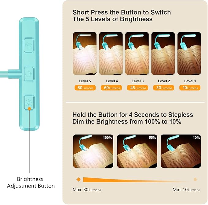 - Rechargeable & Long-Lasting: Built-in 1200 mAh high-capacity battery, the reading light can provide you with 8-80 hours of long-lasting illumination. It only takes two hours to fully charge, and 4 LED indicators can show the real-time power level