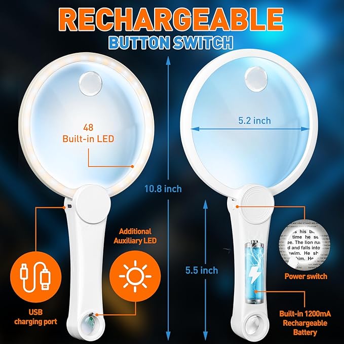 - Super Clear Vision : This magnifying glass for reading is equipped with 49 ultra-bright LEDs that provide three color lighting options to match different tasks. Its upgraded dimmer button prevents accidental touches and conserves power. (short-press to cycle modes; long-press for brightness control)