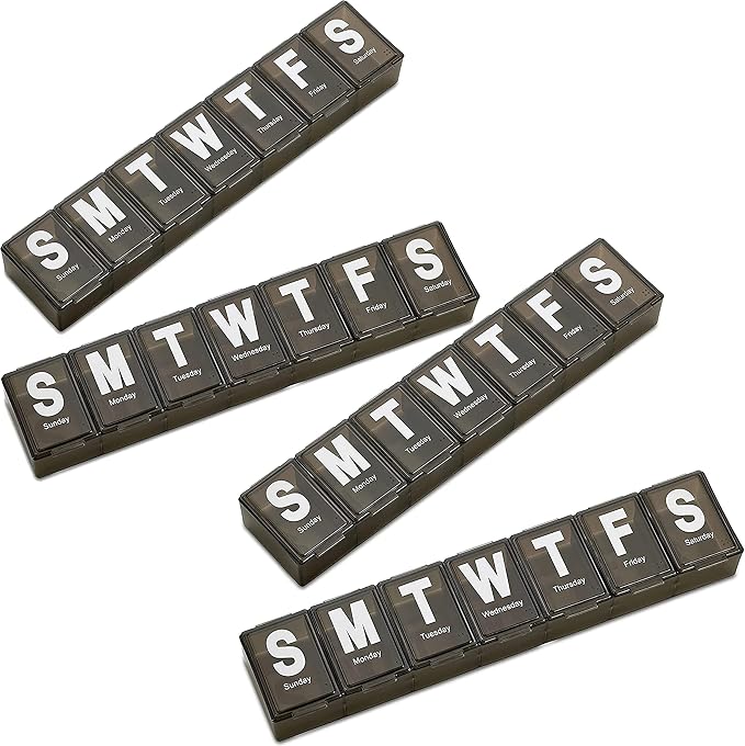 Weekly Pill Organizer - (Pack of 4) Extra Large Vitamin Container with Jumbo Easy to Read Letters, BPA Free - Daily Travel 7 Day Medication Pill Box Case, (Black)