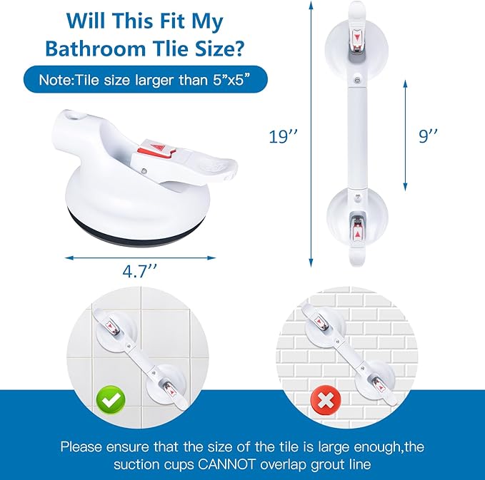 - 【Buying Guide】Before purchasing, note that these suction bath & shower grab bars can only be attached to flat, non-porous, and rigid surfaces , Ideal for natural movement and standing up. For tile installations, ensure each tile is larger than 5"*5" and the suction cups avoid grout lines.